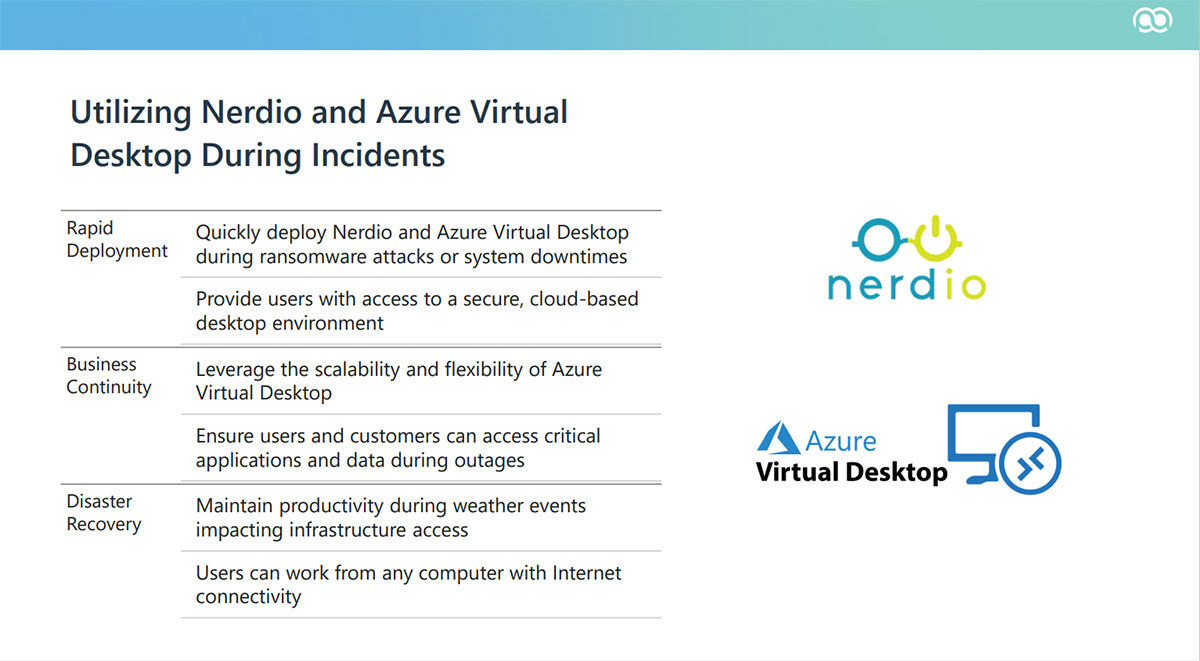 So, what’s the solution? Azure Virtual Desktop and Nerdio. Together, they provide a powerful solution that supports rapid recovery during outages like ransomware attacks or system failures.